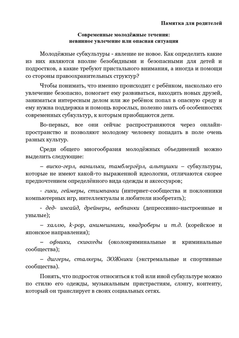 Современные молодёжные течения: невинное увлечение или опасная ситуация. Памятка для родителей