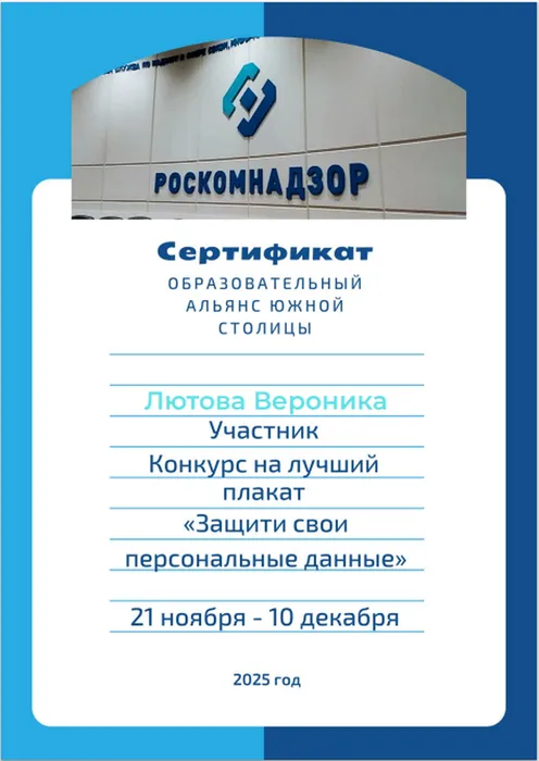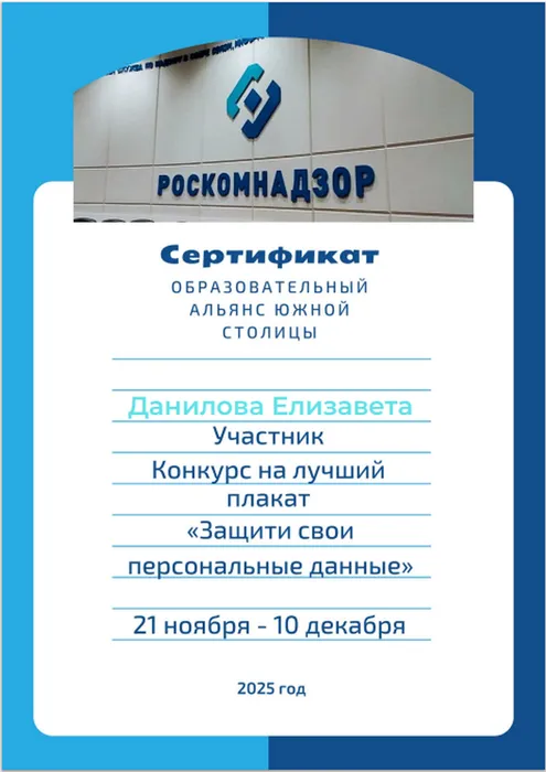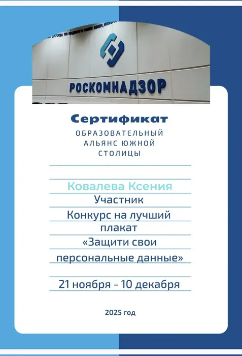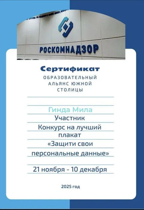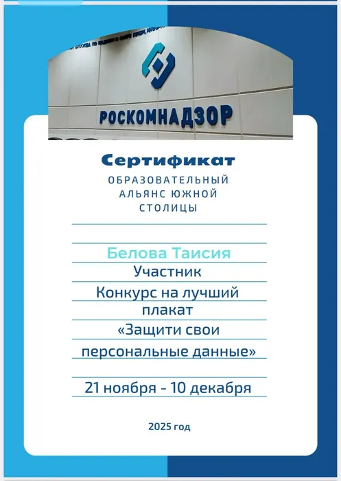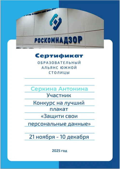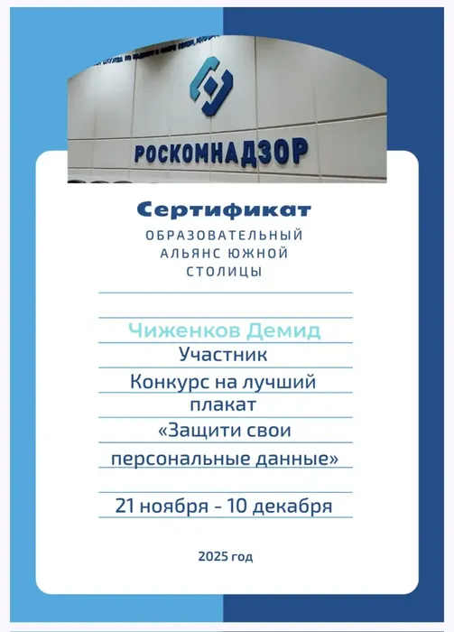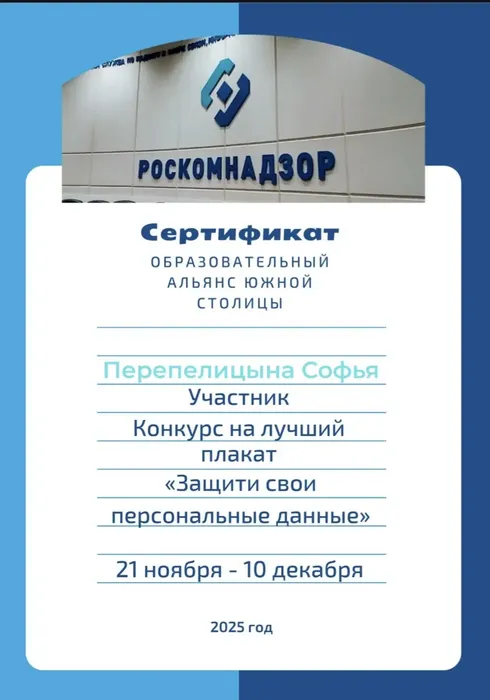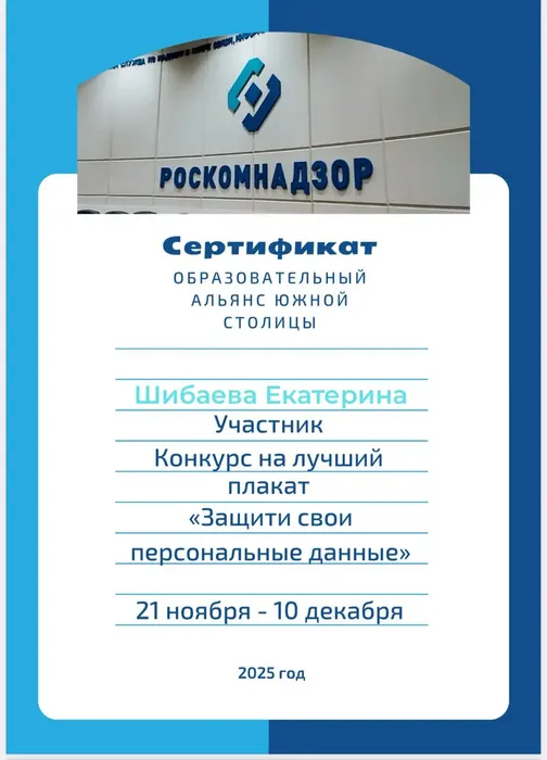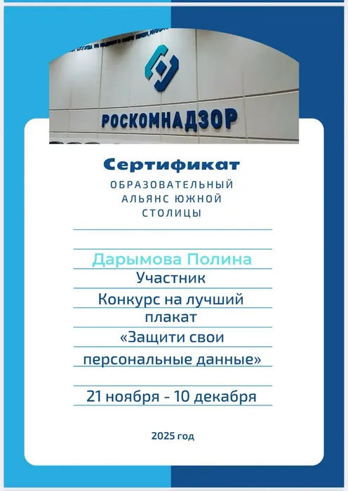 Ученики 6а, 6г, 7б, 8в, 8д классов МБОУ «Школа №109» приняли участие в конкурсе на лучший плакат «Защити свои персональные данные», который проводился Управлением Роскомнадзора по Ростовской области совместно с Муниципальным автономным учреждением города Ростова-на-Дону «Информационно-методический центр образования» в рамках реализации п. 17-20 Плана мероприятий, направленных на обеспечение информационной безопасности детей на 2021-2027 годы, утвержденного приказом Минцифры России от 01.12.2020 № 644; а также в рамках взаимодействия при реализации комплекса просветительских мероприятий проектного офиса «Образовательный Альянс Южной Столицы».